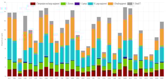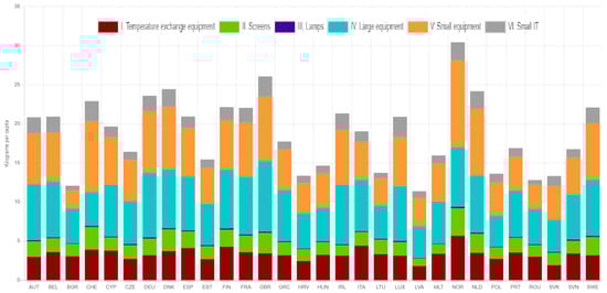 According to the ProSUM project on urban mining [13], the usage and disposal of electronic devices have increased dramatically over a 20-year span, leading to a significant surge in WEEE generation. On their platform (http://www.urbanmineplatform.eu/ accessed on 15 April 2025), they provide visual data illustrating the generation of electronic waste across various WEEE categories over two decades. Figure 1 and Figure 2 show the waste generated per capita within EU states at different points in time.