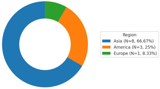 The extracted data was organized according to the research questions and objectives of the review. This included information on datasets, AI techniques and methodologies used for WPCB recycling, materials recovered, and performance metrics such as efficiency and accuracy. One of the reviewers reviewed the extracted data for completeness and accuracy, and any missing or incorrect information was retrieved from the original sources. Figure 4 shows the geographic distribution of the selected studies, with Asia accounting for the largest share.
