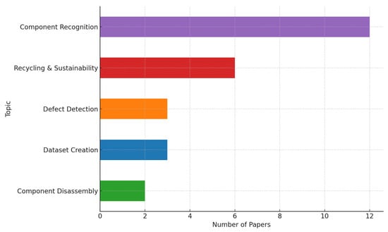 Among different types of WEEE, Waste-Printed Circuit Boards (WPCBs) are the most valuable because they contain high-yield precious metals that can be reused in new production processes if recycled efficiently [5]. To enable automatic disassembly of electronic components from WPCBs, numerous recent AI applications have employed deep learning models to detect and localize electronic components mounted on the board [6,7,8,9]. Despite the promising potential of deep learning for electronic component detection, the field faces several challenges that require systematic investigation. These include the complexity of electronic component arrangements on WPCBs, issues with occlusion and overlapping components, variations in lighting conditions and viewpoints, and the need for real-time processing capabilities in industrial settings [10]. Additionally, the diversity of deep learning architectures and approaches calls for a comprehensive review to determine the most effective methods and inform future research directions.