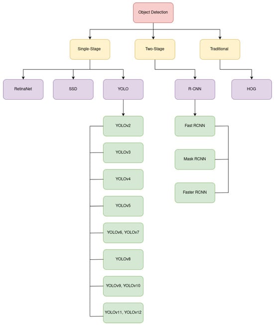 Object detection is a computer vision task that aims to identify and locate objects within an image or video. It combines both classification and localization into single operation. In recent years, object detection models have gained significant popularity due to their wide range of applications, including self-driving cars, surveillance and security systems, and medical image analysis. Given its broad applicability, various deep learning-based object detection models have been proposed over the past decade [53,54]. Most studies focus on improving both detection accuracy and real-time processing speed. Object detection models are generally categorized into three groups: (i) single-stage, (ii) two-stage, and (iii) traditional methods. In single-stage detection, region proposals and object classification are performed in a single step, enabling fast, real-time performance. Notable examples include YOLO [53] and SSD [55]. In contrast, two-stage models first generate region proposals and then perform classification and localization. Well-known two-stage models include R-CNN [54] and Mask R-CNN [56]. Traditional object detection methods, such as those based on Histograms of Oriented Gradients (HOG) [57], represent earlier approaches that relied on handcrafted features rather than deep learning. Figure 7 illustrates the overall flow and evolution of object detection models.