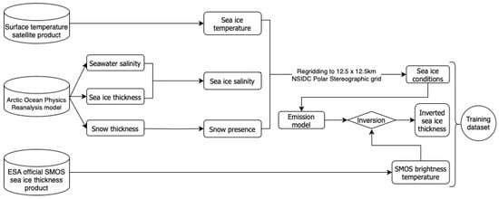 Available data for the Arctic region are extremely limited. Due to the absence of a comprehensive dataset on thin sea ice thickness, it becomes necessary to create one through the use of sea ice emission modeling. The Burke emission model [30], incorporating the Vant formulation for ice permittivity [31], is employed in an inverted manner to generate realistic scenarios of Arctic sea ice thickness distributions. The goal is to replicate these situations as accurately as possible. All variables, i.e., the SMOS TB, the sea ice temperature and salinity, and the snow presence, are first regridded to the 12.5 km × 12.5 km NSIDC Polar Stereographic grid. This workflow for generating the training dataset is summarized in Figure 1. It is noteworthy that the sensitivity of brightness temperature to ice thickness in this frequency band is strongly influenced by ice conditions, specifically temperature and salinity. To avoid imposing an artificial training threshold, the maximum thickness that can be retrieved (the point at which brightness temperature saturation begins) is computed for each configuration of ice conditions. Subsequently, the thickness derived from the model inversion is compared to this maximum thickness. If the latter is smaller, the inverted solution is adjusted to match this maximum thickness.