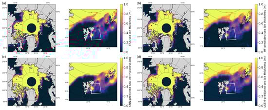 Arctic-wide and Barents Sea-focused maps showing sea ice thickness estimates from each algorithm: ESA (a), RF (b), CNN (c), and LSTM (d). The Arctic-wide map corresponds to 1 December 2019, while the Barents Sea-focused map represents the average over the campaign period, conducted from 19 to 24 March 2014. Red stars indicate the locations of BGEP moorings in the Arctic-wide maps, while the Barents Sea maps highlight the ESA SMOSice campaign sampling area with a white perimeter.