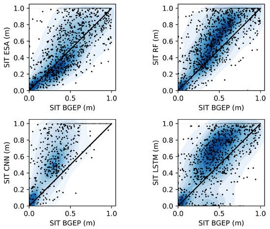 Figure 3 shows the results of comparing the predictions given by the different algorithms, using the BGEP moorings dataset described in Section 2.3. The points are complemented by their respective density to depict the distribution of output values. However, since many data points correspond to 1 m after the imposed limitation, they are not included in the density computation to improve the visualization throughout the thickness range. The RF algorithm presents similar results to ESA, while the CNN tends to overestimate, and the LSTM shows more dispersion and underestimation, especially for thinner ice. The most homogeneous point-density distribution is presented by the RF, highlighting its robustness. The metrics are provided in Table 4, where the initially observed characteristics of each algorithm are confirmed. Although all approaches show similar error, correlation, and dispersion, it is clear that the CNN is overestimating, by approximately 10% more than the others. These results suggest that for this dataset, both the RF and ESA algorithms slightly outperform the others. Therefore, the spatially and temporally coherent approaches, represented by the CNN and LSTM algorithms, do not provide better capture of the sea ice evolution depicted by the BGEP moorings.