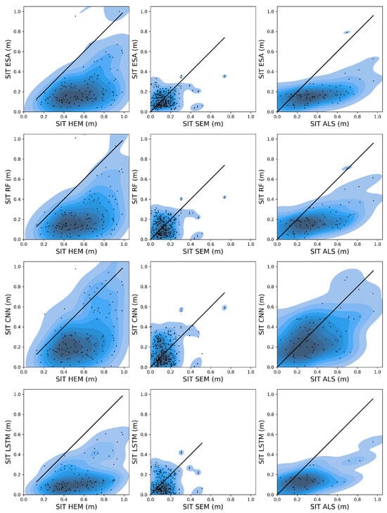 The ESA SMOSice campaign provides a unique dataset that contains sufficient thin sea ice to perform validation. In fact, this dataset was used to validate the ESA SMOS sea ice thickness product described in Section 2.1.1. A similar assessment to that conducted for the BGEP moorings dataset is conducted, using the three sub-datasets that were collected: HEM, SEM, and ALS. Figure 4 shows the validation of the assessed algorithms against these in situ datasets. The different sub-datasets present distinct SIT distributions, allowing for a comprehensive assessment of the algorithm performance. For the HEM data, which cover a broader SIT range, the RF and CNN models show the best agreement with the reference measurements, followed closely by ESA, while the LSTM consistently underestimates SIT across the range. In the case of SEM, which measured very thin ice, none of the algorithms are capable of reproducing the observed values, since predictions are consistently too dispersed. For the ALS dataset, which includes thicker ice, all algorithms tend to underestimate SIT, although the CNN performs better, showing the least bias. It is remarkable that the LSTM shows negative thicknesses, which is physically unrealistic, but this is due to the inherent stochasticity of the algorithm’s architecture. Table 5 summarizes the validation performance of the four algorithms across the three datasets: HEM, SEM, and ALS. In the HEM dataset, the CNN achieved the highest R2 (0.51) and lowest MAE (0.30 m), while the ESA and RF models followed closely with comparable MAE values and moderately lower R2 scores. The LSTM performed similarly in terms of MAE but displayed a lower R2, indicating slightly less correlation with the observed data. For the SEM dataset, performance dropped across all algorithms, with R2 values remaining below 0.25, reflecting the increased difficulty in modeling this dataset. The CNN again had the highest R2 (0.23), but RF and ESA maintained lower MAE values, suggesting a better trade-off between error magnitude and model consistency. Regarding the ALS dataset, all models improved substantially, with the LSTM and RF showing stronger R2 values (0.59 and 0.57, respectively) and lower MAE (0.19–0.22 m), with the CNN and ESA being slightly worse.