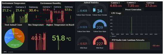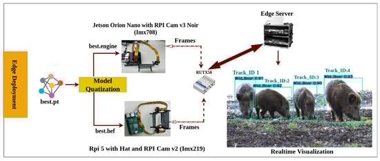 Our edge architecture has been strategically deployed in Parco di San Rossore, near our laboratory, in an area with abundant wildlife activity. To ensure seamless network connectivity across our edge setup, we placed a Teltonika RUTX50 router (accessed on 1 July 2025) approximately 600 m away from the edge server in Figure 1. The RUTX50 is a high-performance industrial grade 5G/4G LTE router featuring dual SIM slots for failover, Ethernet/Wi-Fi connectivity, VPN and firewall security, and remote management capabilities. It provides reliable and secure wireless connectivity in remote and outdoor environments. The edge server, a NOMAD 5G unit, is equipped with GPU/TPU acceleration, NVMe storage, and 5G, LTE, and Wi-Fi 6 connectivity. It handles real-time AI inference, data buffering, and CSV logging while supporting tools like Tailscale and Grafana for secure remote access and system monitoring. The edge deployment consists of two distinct configurations, one optimized for daytime wildlife monitoring and the other for nighttime operations. For night vision object detection, we utilize an NVIDIA Jetson Orin Nano Super Developer Kit (Orin Nano) (accessed on 1 July 2025), which delivers 67 TOPS of AI performance with 1024 CUDA cores and 32 Tensor Cores, based on NVIDIA’s Ampere architecture. The software stack includes CUDA (12.6.68), cuDNN (9.0.3), TensorRT (10.3.0), OpenCV (4.11.0), PyTorch (2.5.0a0+872d972e41.nv24.08), and Python (3.10.12), running on JetPack 6.2 with support for YOLOv8 (8.3.74), ONNX, and DeepStream (7.1). The board supports multiple I/O interfaces including MIPI CSI, GPIO, I2C, SPI, and PCIe. For imaging, we employ a CSI connected Raspberry Pi Camera Module 3 Wide-Angle NoIR (accessed on 1 July 2025), featuring the Sony IMX708 sensor. This sensor supports up to 12-megapixel resolution, CS- or M12-mount lens options for flexibility and is paired with a 48-LED (850 nm) IR crown (accessed on 1 July 2025) for effective night vision. This enables the capture of high-quality images even in total darkness, supporting accurate detection, tracking, and counting of animals at night. The daylight configuration features a Raspberry Pi 5 (Rpi5) (accessed on 1 July 2025) integrated with a Raspberry Pi Camera Module 2 (accessed on 1 July 2025) (Rpi CamV2), which features a Sony IMX219, 8-megapixel sensor an upgrade over the original 5-megapixel OmniVision OV5647 sensor. The RPi5 features a quad-core ARM Cortex-A76 CPU, PCIe 2.0, dual MIPI CSI, USB 3.0, and 40-pin GPIO, supporting lightweight AI inference with TensorFlow Lite (2.14.0), NCNN (v20250503), and OpenVINO (v2025.0), and is compatible with accelerators like the Hailo-8 and Coral TPU. Both sets of configurations continuously detect, track, and count objects, the presence of animals in the camera FOV, and transmit the processed frames to the edge server while also sending time-series data using MQTT publishers to Influxdb2 database. For enhanced monitoring, we use Grafana to visualize key performance metrics such as power consumption, bandwidth usage, and device health status remotely. For model deployment and optimization, we employed different inference techniques tailored to each edge device. On the Orin Nano, we remotely mounted the best.engine FP16 TensorRT model using a K3s Docker container (rancher/k3s:v1.33.2-k3s1), ensuring optimized inference speeds while balancing power consumption. The TensorRT-optimized model provides better frame rates (FPS) and lower latency compared to running a standard PyTorch model. In contrast, for Rpi 5 with Hailo-8 HAT, we deployed a quantized best.hef model, which takes advantage of the 13 TOPS computing power of the Hailo accelerator for efficient AI inference. The overall design of the system ensures a balance between accuracy, real-time performance, and energy efficiency, making it highly suitable for wildlife monitoring in remote areas.