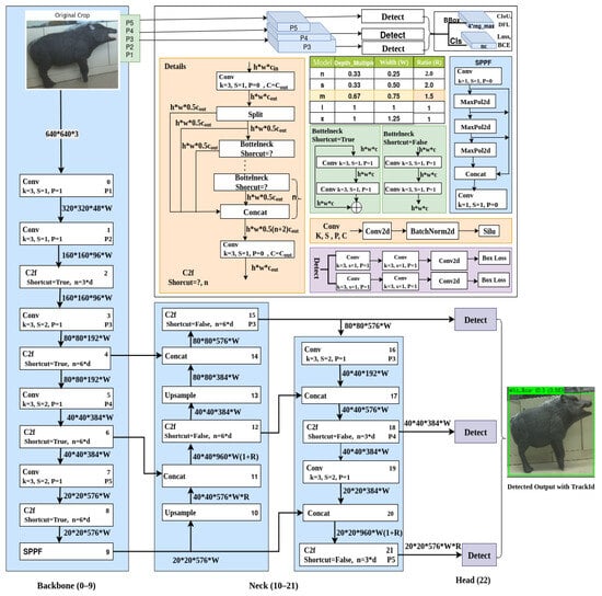 The detection head is composed of lightweight Conv layers (primarily 1 × 1 and 3 × 3) that process each refined feature map independently (P3, P4, P5), and avoid complex residual or cross-stage connections to ensure fast inference. Each head produces predictions in the form of a tensor that encodes bounding boxes, objectness scores, and class probabilities, with the final output being P3 → 80 × 80 × 576, P4 → 40 × 40 × 384, P5 → 20 × 20 × 576. These outputs are optimized for the detection of large, medium, and small objects, respectively. The head uses anchor-free detection and applies non-maximum suppression (NMS) during inference to filter overlapping predictions. Finally, we obtain the detected objects as output with class names, confidence score, and bounding box.