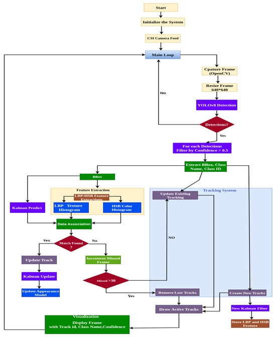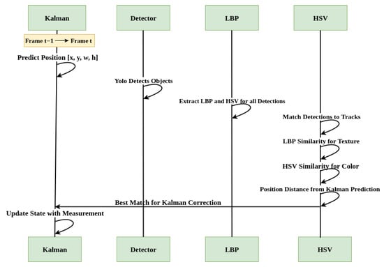 The tracking process operates in a step-by-step pipeline shown in Figure 4, optimized for edge continuum inference, with each module detection, prediction, feature matching, and re-identification designed for computational efficiency and reliability. In the following subsections, we detail each component of the tracking pipeline and its integration into the YOLOv8m-based detection framework.