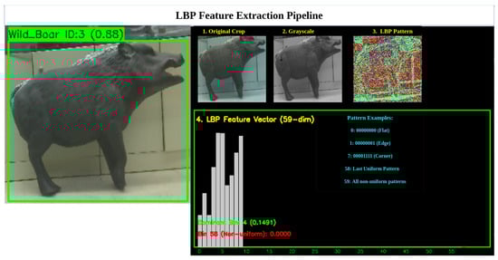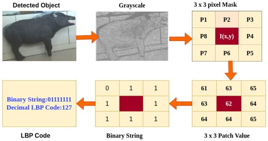 We apply the LBP transform to the grayscale image within each YOLOv8 detection bounding box to extract local texture features such as edges, flat regions, and corners. For each pixel, we compare it to its eight neighbors in a 3 × 3 grid and compute a decimal LBP code (0–255) that encodes local texture patterns. The resulting LBP and source images are saved for use in the next stage, supporting robust object re-identification and tracking. For each pixel in the grayscale image in Figure 5, excluding border pixels, consider its neighborhood .