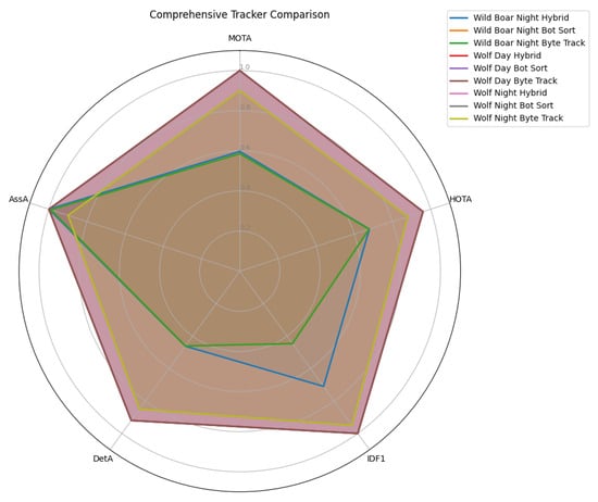 - Lightweight and Robust Tracking Algorithm for Challenging Real-World Conditions: We propose a lightweight hybrid tracking algorithm that outperforms state-of-the-art methods such as ByteTrack and BoT-SORT across standard MOT metrics (MOTA, HOTA, IDF1), offering enhanced trajectory consistency and improved occlusion handling. The framework is evaluated on real-world wildlife footage captured under both day and night conditions. On particularly challenging nighttime wild boar sequences, it improves IDF1 by 57.8% (from 0.45 to 0.71), increases MOTA (from 0.58 to 0.60), and achieves the lowest number of false negatives (FN = 155). For wolf tracking, it matches top-performing trackers in daytime conditions (MOTA = 1.00, IDF1 = 1.00) and maintains strong performance at night (IDF1 = 0.95). Overall, the proposed approach delivers accurate and consistent tracking under complex environmental conditions.