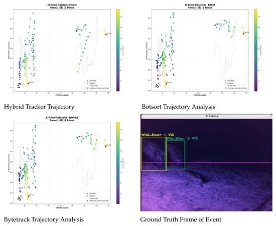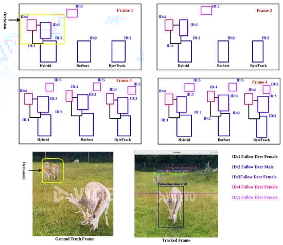 Our comparative analysis with GT annotations demonstrates that the proposed hybrid tracker outperforms both BoT-SORT and ByteTrack in occlusion handling. As shown in Figure 12, in the case of frame 1 and frame 2, the hybrid tracker successfully handles occlusions beginning from the first frame by detecting all the animals inside the occlusion yellow box, while the other two trackers only begin to manage occlusions starting from frame 3. Both BoT-SORT and ByteTrack fail to maintain consistent object identities during the occlusion period, whereas the hybrid tracker accurately tracks all animals despite visual overlaps.