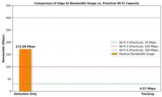 This 300× bandwidth reduction is achieved without compromising detection accuracy, enabling scalable and power-efficient wildlife monitoring. Figure 13 compares the bandwidth usage of two edge AI pipeline configurations detection only and tracking against practical Wi-Fi capacities (Wi-Fi 4, 5, and 6). The detection-only pipeline consumes approximately 172 Mbps, which significantly exceeds the bandwidth typically supported by Wi-Fi 4 and 5 in resource-constrained environments. In contrast, the tracking configuration uses just 0.57 Mbps, demonstrating its suitability for low-bandwidth, real-time deployment over wireless networks.