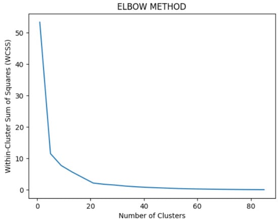 The computation of the four methods recalled in Section 2 was performed using the Colab hosted Jupyter Notebook service that provides free-of-charge access to computing resources (namely: CPU, Python, and a rich pool of ML libraries). Preliminary, the elbow method was applied to the input dataset (Figure 1). Figure 2 shows a plot of WCSS against the number of clusters. The point on the plot where the WCSS curve starts to flatten suggests that was the “optimal” number of clusters in our case. After this step, we made further measurements to consolidate the somehow subjective interpretation of the Elbow plot. Table 5 reports the results. As the value, we adopted 70. This value produced , which represented the best trade-off between the suggestion coming from the application for the three selected cluster validity indices and our judgment about a satisfactory partition of the input dataset (Section 2.2).