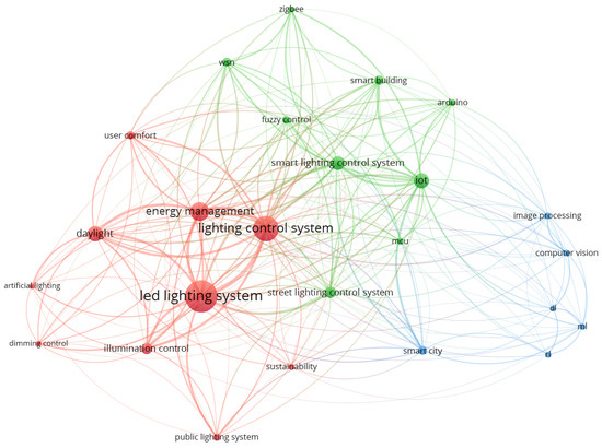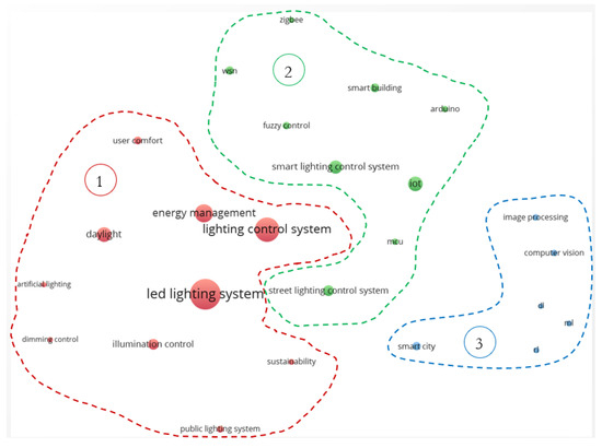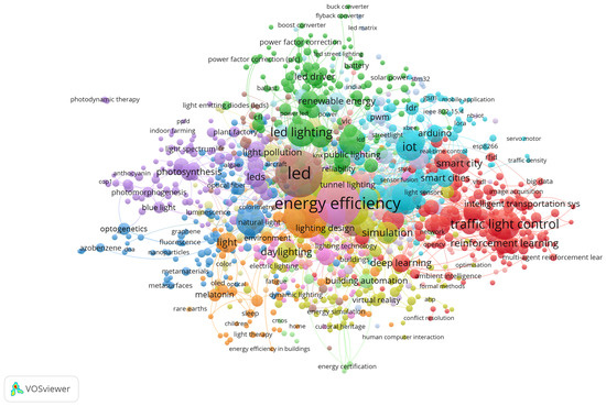 Lighting Systems (LSs) are a key component of modern cities. Across the years, thousands of articles have been published on this topic; nevertheless, a map of the state of the art of the extant literature is lacking. The present review reports on an analysis of the network of the co-occurrences of the authors’ keywords from 12,148 Scopus-indexed articles on LSs published between 1995 and 2024. This review addresses the following research questions: (RQ1) What are the major topics explored by scholars in connection with LSs within the 1995–2024 time frame? (RQ2) How do they group together? The investigation leveraged VOSviewer, an open-source software largely used for performing bibliometric analyses. The number of thematic clusters returned by VOSviewer was determined by the value of the minimum number of occurrences needed for the authors’ keywords to be admitted into the business analysis. If such a number is not properly chosen, the consequence is a set of clusters that do not represent meaningful patterns of the input dataset. In the present study, to overcome this issue, the threshold value balanced the score of four independent clustering validity indices against the authors’ judgment of a meaningful partition of the input dataset. In addition, our review delved into the impact that the use/non-use of a thesaurus of the authors’ keywords had on the number and composition of the thematic clusters returned by VOSviewer and, ultimately, on how this choice affected the correctness of the interpretation of the clusters. The study adhered to a well-known protocol, whose implementation is reported in detail. Thus, the workflow is transparent and replicable.