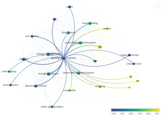 The thesaurus keeps the distinction between the strings “lighting control system” and “smart lighting control system”. The former refers to authors’ keywords that do not mention the adjectives intelligent or smart to describe the lighting system, while the latter do. The terms smart or intelligent are largely used to refer to lighting control systems that combine the IoT technology with some form of AI [2]. It can certainly be said that the “smart lighting control system” term is more recent than the other term.