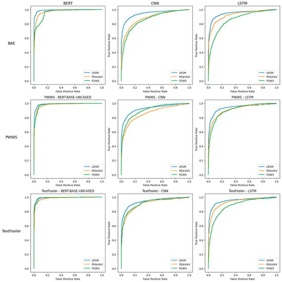 Figure 4, LRSM’s curve consistently lies above those of RS&V and FGWS, indicating it achieves a higher true-positive rate (TPR) for the same false-positive rate (FPR). This advantage appears across the three adversarial methods (BAE, PWWS, and TextFooler) and the different NLP models (BERT, CNN, and LSTM), although the margin varies. In some cases—particularly with BERT—FGWS tracks closer to LRSM, but overall, LRSM maintains a better balance of TPR and FPR.