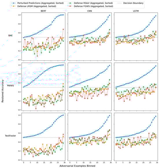 50]. These algorithms generated adversarial examples designed to manipulate the sentiment predictions of the trained models. The adversarial examples were then passed to LSTM, CNN, and BERT models to measure the impact of the attacks on their performance. Next, the combined dataset of adversarial and benign examples was exposed to three defense algorithms: RS&V (Synonym Random Substitution Voting), FGWS (Fixed Gradient Word Substitution), and LRSM. The defenses aimed to neutralize the adversarial perturbations while not falsely labeling benign examples as adversarial. The performance of each defense was evaluated using precision, recall and F1 score of the predictions, while restored accuracy (accuracy on adversarial examples) was also measured to assess how much of the adversarial damage was recovered.