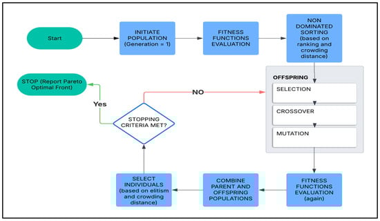 From Figure 2, NSGA-II starts by initializing a population of candidate solutions randomly [33]. Each solution is represented as a vector of decision variables corresponding to the problem at hand. The population size, N, is defined, and the algorithm uses the concept of non-dominance to classify solutions [33]. The population is divided into multiple fronts based on dominance relationships. The first front consists of non-dominated solutions (Pareto-optimal solutions), the second front includes solutions dominated only by those in the first front, and so on. Each front is assigned a rank: solutions in the first front receive rank 1, the second front rank 2, etc. [34].