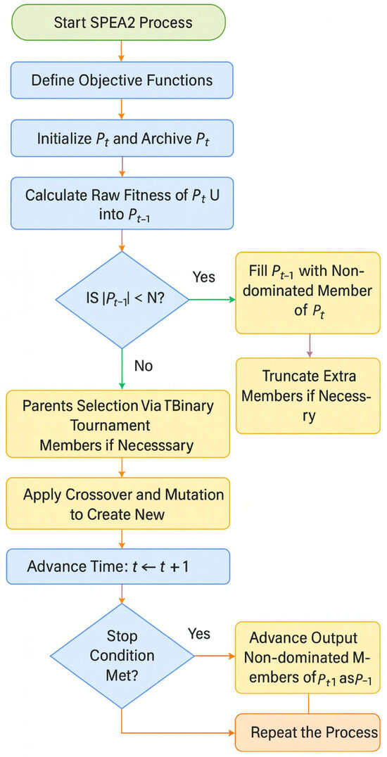 Compared to other evolutionary algorithms, SPEA2 begins by generating an initial population of candidate solutions, as shown in Figure 3 [41]. In addition to the main population, SPEA2 maintains an archive (external population) to store non-dominated solutions discovered during the search [42]. The archive has a fixed size, Narchive, and is updated each generation. A unique feature of SPEA2 is its fitness assignment, which combines information about both dominance and density of solutions [43]. This involves calculating a strength value and a raw fitness value [44]: