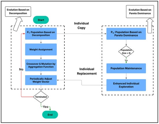 - Replacement: Each subproblem updates its solution if the new offspring improves performance according to the subproblem’s objective, replacing the current solution based on Pareto dominance [54].