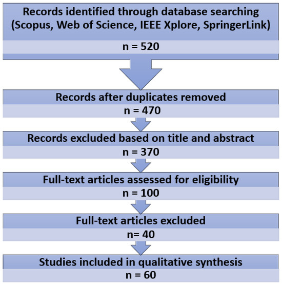 To enhance the transparency and reproducibility of this review, a systematic literature screening was conducted based on PRISMA 2020 guidelines [57]. Figure 5 illustrates the flow of information through the phases of identification, screening, eligibility, and inclusion. The process involved querying major databases including Scopus, Web of Science, IEEE Xplore, and SpringerLink.
