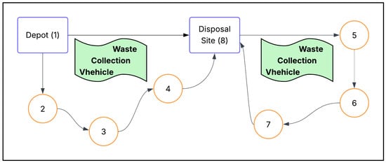 Adapted from [17]: Sustainable Periodic Capacitated Arc Routing Problem (PCARP) for municipal solid waste (MSW) management. Circles represent waste collection points, squares denote the depot and disposal site, and wavy rectangles indicate waste collection vehicles.