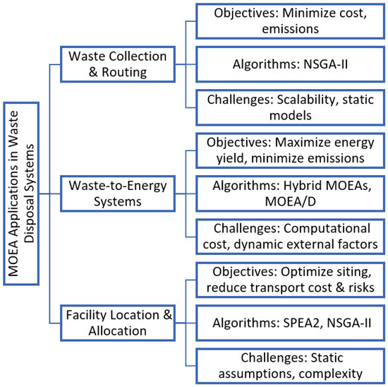Future applications should focus on developing more adaptive, resilient approaches capable of handling the evolving nature of waste generation and management. A comprehensive taxonomy of these MOEA applications across waste disposal domains is illustrated in Figure 9, providing a visual summary of the relationships among optimization areas.