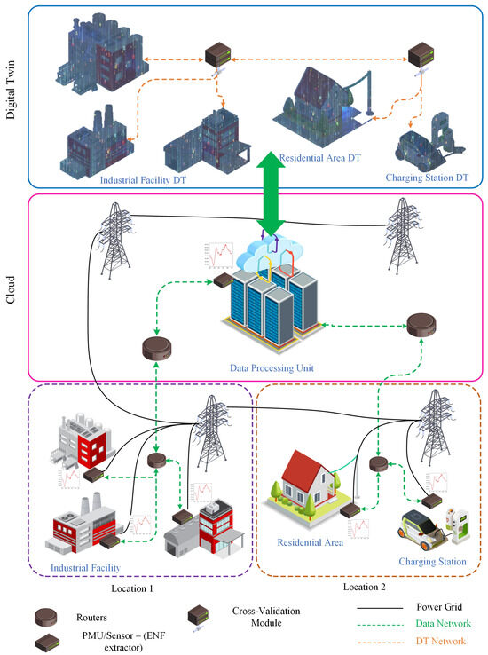 The application of the ENF in IoT and smart grid contexts is emerging, building on its forensic roots to enable anomaly detection and authentication in distributed systems. In smart grids, ENF signals can serve as timestamps for data integrity, particularly in detecting FDI attacks, where adversaries manipulate sensor readings to disrupt operations [32,33]. For example, ENF-based frameworks have been proposed for real-time monitoring, integrating with Phase Measurement Units (PMU) to verify data provenance with accuracies up to 95% [7,34]. The broader literature on IoT-enabled smart grids emphasizes security challenges but rarely incorporates the ENF specifically. Surveys highlight the role of the IoT in improving grid efficiency through real-time analytics while also noting vulnerabilities such as unauthorized access and cyber threats [35]. For example, increased connectivity expands attack surfaces, allowing malware to hijack devices and cause grid disruptions [36]. Solutions often involve blockchain or anomaly detection, but the ENF offers a complementary physical-layer anchor, as seen in fault detection systems for DC microgrids [37]. However, existing works lack the integration of the ENF with virtual representations, such as DTs, a gap that our survey addresses by exploring the potential of the ENF in Metaverse-linked infrastructures.