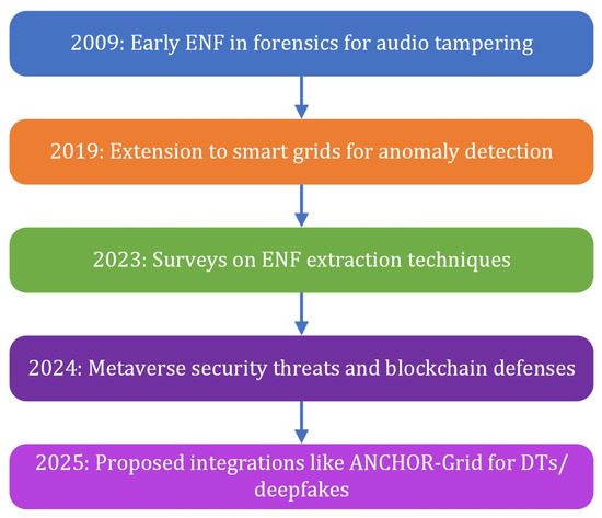 Figure 2 shows a timeline of the evolution of ENF research from forensics to Metaverse applications. The ENF has been extensively studied as a forensic tool for authenticating and timestamping multimedia recordings, leveraging the unique fluctuations in power grid frequencies (typically around 50 Hz or 60 Hz) that are embedded as subtle signals in audio or video [7]. A foundational survey by Ngharamike et al. (2023) provides a detailed overview of ENF-based digital multimedia forensics, covering extraction techniques such as spectrogram analysis and wavelet transforms, as well as applications in tampering detection and challenges, including noise interference and regional variability [3]. The work emphasizes the reliability of the ENF, achieving up to 92% accuracy in audio authentication by matching the extracted signals to the reference databases [29,30]. Recent advancements include the automated estimation of the ENF in static and nonstatic videos, with algorithms demonstrating robustness to motion artifacts and achieving mean absolute errors as low as 0.15 Hz [31]. In comprehensive studies, the factors affecting ENF matching are explored, such as environmental noise and device variability, highlighting the need for adaptive filtering to improve forensic accuracy [25]. Although these works establish the ENF as a mature tool in forensics, they primarily address standalone multimedia analysis, with limited extension to interconnected virtual environments.