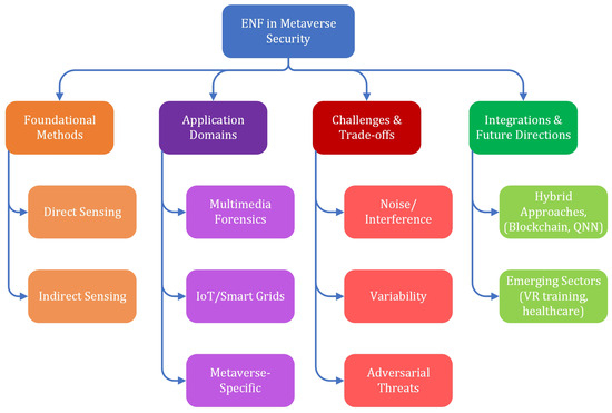 Hierarchical taxonomy of ENF applications in Metaverse security, foundational methods, application domains, challenges, and future integration pathways.
