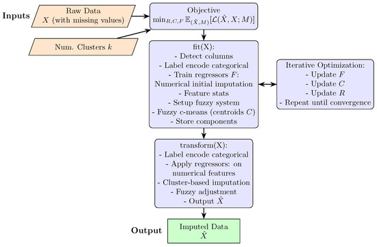 Existing imputation techniques range from simple statistical approaches to advanced model-based methods that iteratively improve estimates by predicting missing features from observed ones. To handle datasets with mixed numerical and categorical variables, we propose a new imputation method that integrates machine learning, clustering, and fuzzy logic, as illustrated in Figure 1 and in Algorithm 1.