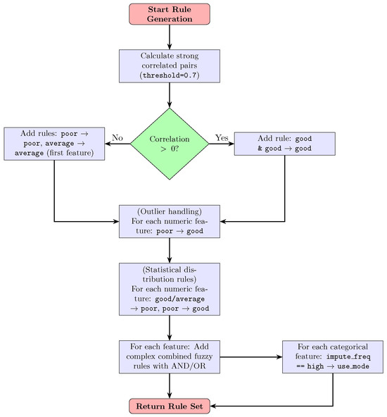 The fuzzy rule system is built by first identifying numeric columns and detecting pairs of features with strong correlations above a threshold of 0.7. For each positively correlated pair, a rule is established: if both features belong to the “good” membership class, then the imputed value should also be classified as “good.” For negatively or weakly correlated pairs, default rules map membership grades (“poor,” “average”) of the primary feature to corresponding imputation quality levels.