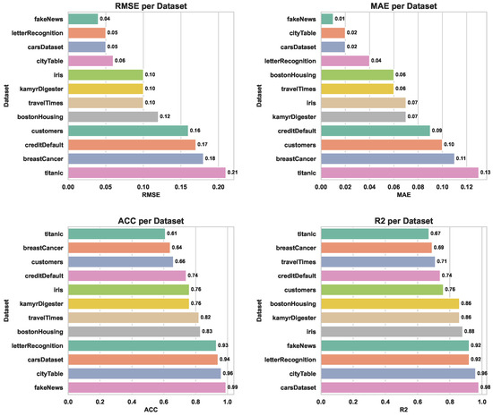 Charts demonstrating RMSE, MAE, R2, and ACC metrics across datasets.