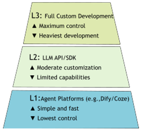 Figure 1 classifies agent development into three hierarchical tiers based on technical complexity. At the foundational level (L1, platform-driven), developers utilize no-code/low-code platforms such as Dify or Coze for rapid deployment, trading minimal coding requirements for constrained customization. Progressing to the intermediate tier (L2, API-driven), practitioners integrate LLM APIs (e.g., OpenAI and Anthropic) directly, achieving moderate control at the cost of limited built-in orchestration capabilities. The apex tier (L3, custom-built) implements full-stack agent frameworks like LangChain or AutoGen, offering maximum flexibility while incurring high DevOps/MLOps overhead. Each ascending tier demands progressively greater technical expertise but enables deeper alignment with complex requirements such as real-time analytics and enterprise-grade security.