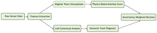 The DT serves as a physics-based virtual replica that synergizes with AI through three critical mechanisms [34,35]: (1) real-time anomaly diagnosis via counterfactual simulations (e.g., modeling “bearing clearance + 0.1 mm” to pinpoint root causes by comparing simulated vs. actual sensor outputs), (2) synthetic failure data generation for training AI agents on rare faults (e.g., turbine blade crack propagation) to enable accurate remaining useful life (RUL) forecasting, and (3) closed-loop validation of maintenance actions by simulating operational impacts (downtime, energy costs) against constraints like sustainability targets. This physics–AI fusion resolves PdM’s core challenges: data scarcity, model brittleness, and operational silos [36,37].