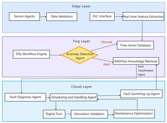 As illustrated in Figure 4, the proposed predictive maintenance system employs a three-tiered edge–fog–cloud architecture to achieve self-evolving capabilities. Three-phase implementation begins at the edge layer, deploying IIoT sensors and PLC gateways for real-time equipment monitoring (vibration, temperature, and current). Raw data undergoes local preprocessing via anomaly filters and feature extraction techniques. This transforms raw signals into validated, transmission-ready insights. Briefly, edge gateways perform real-time preprocessing—noise filtering, compression, and feature extraction—to minimize latency and bandwidth load. Critical alerts (e.g., threshold violations) trigger immediate actions (e.g., emergency shutdowns), while aggregated data streams to the fog layer [42,43].