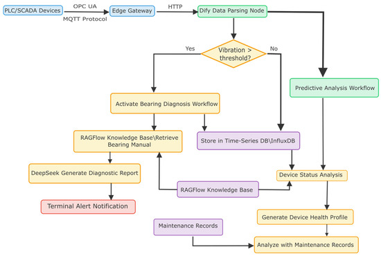 When the developed prototype system is put into practical application, the agentic AI-based PdM system begins at the data parsing node, where industrial devices (PLCs/SCADA) transmit sensor data via OPC UA/MQTT protocols. Then, the anomaly detection node will judge if the parsed vibration signals have undergone threshold validation. If exceeded, a bearing diagnosis workflow activates, while normal data streams directly to InfluxDB for storage. The fault diagnosis workflow leverages RAGFlow to retrieve relevant technical documentation from its knowledge base, enabling the DeepSeek model to generate root cause reports and maintenance strategies. The summing-up node serves as the feedback loop by collecting maintenance execution data, comparing diagnostic predictions with actual outcomes, and updating the knowledge base in RAGFlow with successful cases. Crucially, RAGFlow’s knowledge base serves a dual role—supporting both real-time diagnostics and long-term analytics. This creates a symbiotic loop: new maintenance outcomes continuously update the knowledge repository, while historical records refine predictive models.