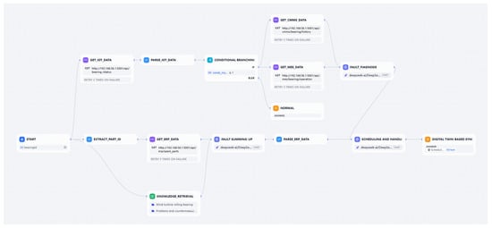 Figure 5 shows the basic routine to build an agentic AI-based PdM system from data acquisition to actionable insights, with parallel processing paths for real-time alerting and predictive maintenance. Figure 6 is the visual low-code workflow in the Dify platform. The prototyping process indicates that Dify reduces LLM app development from weeks to hours by abstracting LLMOps complexities while retaining extensibility via Python 3.9/API hooks.