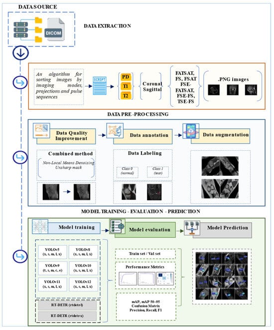 The proposed methodology comprises several sequential stages. At the initial stage, images were extracted from the source in DICOM (Digital Imaging and Communications in Medicine) format. These images were then automatically sorted based on imaging modalities, anatomical projections, and pulse sequences, followed by export to a two-dimensional format with the PNG (portable network graphics) extension. To enhance visual quality, a preprocessing step was applied using a combined method that included Non-Local Means Denoising and Unsharp Mask techniques. Manual image annotation was performed using the Label Studio platform. Subsequently, data augmentation techniques were employed to expand the size of the training dataset. During the training phase, models from the YOLO and RT-DETR families were utilized, including YOLOv5, YOLOv8–YOLOv12, RT-DETR-l, and RT-DETR-x. Model performance was assessed using standard evaluation metrics, such as precision, recall, F1-score, and mAP, based on which the most effective model was selected. In the final stage, the trained model was deployed for automatic detection of meniscus tears in new MRI images.