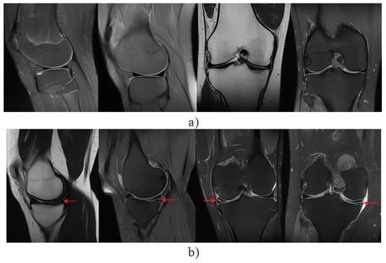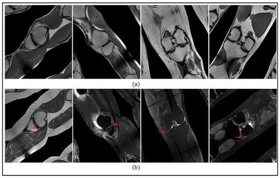 (a) Images without a meniscus tear (class 0); (b) images with a confirmed meniscus tear (class 1). Arrows indicate the site of the meniscus tear.