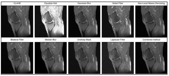 The original dataset was acquired using different MRI systems with varying technical specifications, including magnetic field strength, slice thickness, and manufacturer. The scans were performed with diverse scanning protocols and acquisition parameters. From the complete series of images, only those slices in which the menisci were clearly visualized were selected. In accordance with clinical diagnostic guidelines, the menisci were classified as either intact (healthy) or exhibiting signs of tear. The classification of torn menisci was based on the presence of an abnormal intrameniscal hyperintense signal extending to at least one articular surface. Additional indicators included meniscal deformation, disrupted contours, or displacement of a fragment []. The inclusion criteria for image analysis required clear MRI evidence of a meniscus tear confined to a single compartment of the knee joint (either medial or lateral), with no concomitant tear in the opposite meniscus.