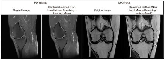 Based on the results of the comparative analysis, the combined approach of Non-Local Means Denoising and Unsharp Mask was selected, as it demonstrated the best quantitative performance (MSE = 32.55; PSNR = 41.37; SSIM = 0.92), indicating its high effectiveness in MRI image preprocessing. In addition, this method produced the most visually satisfactory results, achieving optimal noise suppression while preserving anatomical boundaries (Figure 5).