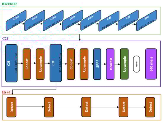 The backbone output layer is immediately followed by the next SPPF (Spatial Pyramid Pooling Fast) block on the neck. The SPPF block is designed to provide a multi-scale representation of the feature map. The SPPF block allows the model to capture features at different levels of abstraction by pooling at different scales []. There are also several blocks such as concat and upsample in the neck. In the YOLOv8 model, the resolution of the feature map is increased based on upsampling, where the nearest neighbor technique is applied in upsampling. In feature map upsampling, nearest pixels are repeated, and upsampling through concat increases the number of channels without changing the size. In addition, YOLOv8 has three heads for small, medium, and large features, which are connected to different levels, and the size of the feature is determined with respect to the image.