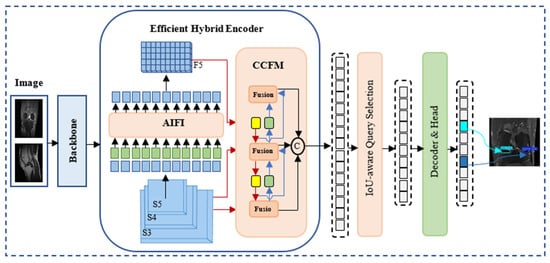 During feature processing, the RT-DETR model incorporates two innovative modules: AIFI (Attention-Enhanced Intra-Scale Feature Interaction) and CCFM (Convolution-Driven Cross-Scale Feature Fusion). The AIFI module performs deep feature vectorization using a lightweight Transformer encoder, followed by feature reconstruction through a skip-connection-based network. This module enhances intra-scale feature representation while maintaining computational efficiency. At the final stage of the RT-DETR pipeline, the CCFM module executes intelligent aggregation of multi-level features, enabling a comprehensive representation across spatial scales. The detection head of RT-DETR applies a noise suppression strategy inspired by the DINO approach [], which significantly improves the quality of query-to-object matching and accelerates model convergence during training.