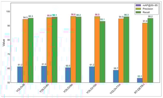 The mAP@50 score for YOLOv8-x is 0.975, exceeding the 0.929 achieved by RT-DETR-l. The advantage becomes even more pronounced with the stricter mAP@50–95 criterion, where YOLOv8-x scores 0.616 compared to 0.531 for RT-DETR-l. These differences confirm the greater robustness of YOLOv8-x in accurately localizing and classifying objects, even in complex scenarios. An analysis of the precision–confidence curves shows that YOLOv8-x achieves maximum precision at a confidence threshold of 0.985, while RT-DETR-l requires only 0.935 to reach a similar level. This indicates a more confident prediction strategy in YOLOv8-x.