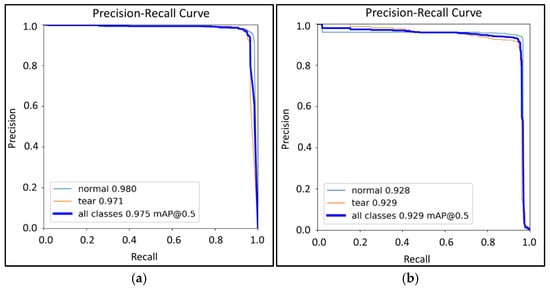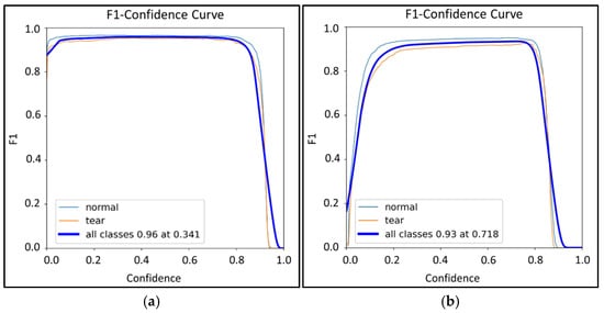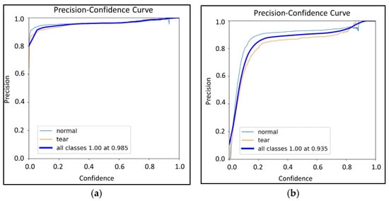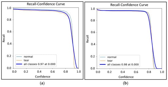 The curves for YOLOv8-x exhibit a steeper initial increase and more stable behavior as the confidence threshold grows, particularly for the «tear» class. In contrast, RT-DETR-l loses recall much more rapidly. Such stability is critically important in clinical contexts, where minimizing missed detections is of utmost importance.