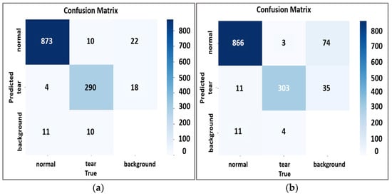 An additional factor affecting the results is the structural imbalance of classes in the training set. Despite the presence of images with both normal and damaged menisci, objects of the «normal» class were quantitatively predominant. This is due to the annotation features: in the case of «normal», both menisci were marked as separate objects, while in the case of a tear, only one pathological structure was annotated. As a result, the proportion of objects of the «normal» class was 5992 against 1998 objects of the «tear» class. Such an imbalance does not reflect the real prevalence of pathologies but affects the behavior of the model, shifting the emphasis towards the «norm». The greatest number of errors in both models was recorded precisely between the «tear» and «background» classes, which may be due to the low contrast of individual images, in which the tear was poorly visualized, making it difficult to localize both for the model and for a person.