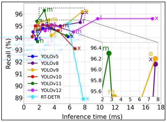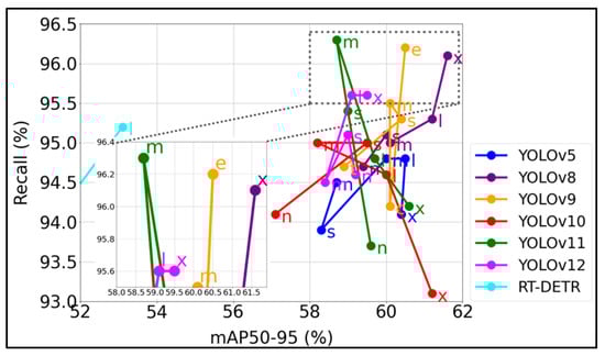 In this study, the RT-DETR models (RTDETR-l and RTDETR-x) were also trained on the same image dataset to enable a comparative evaluation of their performance and efficiency against the YOLOv5 and YOLOv8–YOLOv12 model families. RT-DETR is a state-of-the-art end-to-end object detector that offers real-time performance while maintaining high accuracy. The network structure of the RT-DETR model architecture is based on Transformer and is shown in Figure 8. The RT-DETR model architecture includes three main modules such as feature extraction backbones, a hybrid feature enhancement encoder, and a Transformer decoder with an auxiliary prediction engine []. The working principle of this network structure of the RT-DETR model is based on a hierarchical multi-scale feature processing mechanism, i.e., the model first improves the features at each scale and then performs cross-scale feature integration. In its architecture, RT-DETR uses an efficient CNN architecture (or can be a series of ResNet []) or a specially optimized HGNet [] as a backbone network.