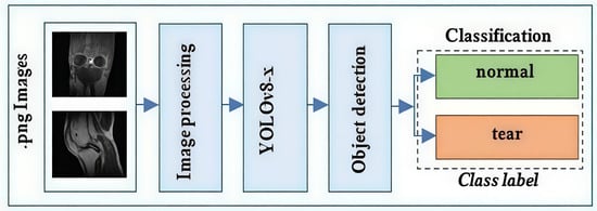 Two modern families of object detection models were employed in this study: YOLO (versions YOLOv5 and YOLOv8–YOLOv12) and RT-DETR, both capable of simultaneous localization and classification of pathological changes. The model architectures were adapted for the task of medical image analysis, with input data consisting of a series of 2D MRI slices in 640 × 640 × 3 format. The overall methodology for automatic detection of meniscus tears is illustrated in Figure 1.