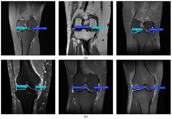 In comparison with the aforementioned studies, the YOLOv8-x model proposed in this research demonstrates excellent performance: ACC = 96.0, TPR = 96.1, F1 = 96.0, and mAP@0.5:0.95 = 0.616. Of particular note is the sensitivity value achieved, TPR = 96.1, which is the highest among all studies considered. This highlights the model’s high ability to detect even mild meniscus tears, minimizing the risk of missing pathology.