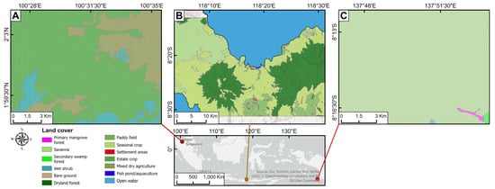 Area of interest (AOI) with varying land cover types in: (A) Rokan Hilir, (B) Bima and Dompu, and (C) Merauke Regencies.